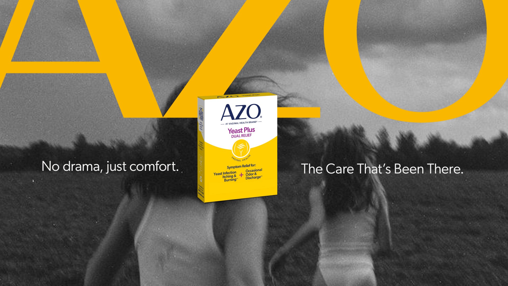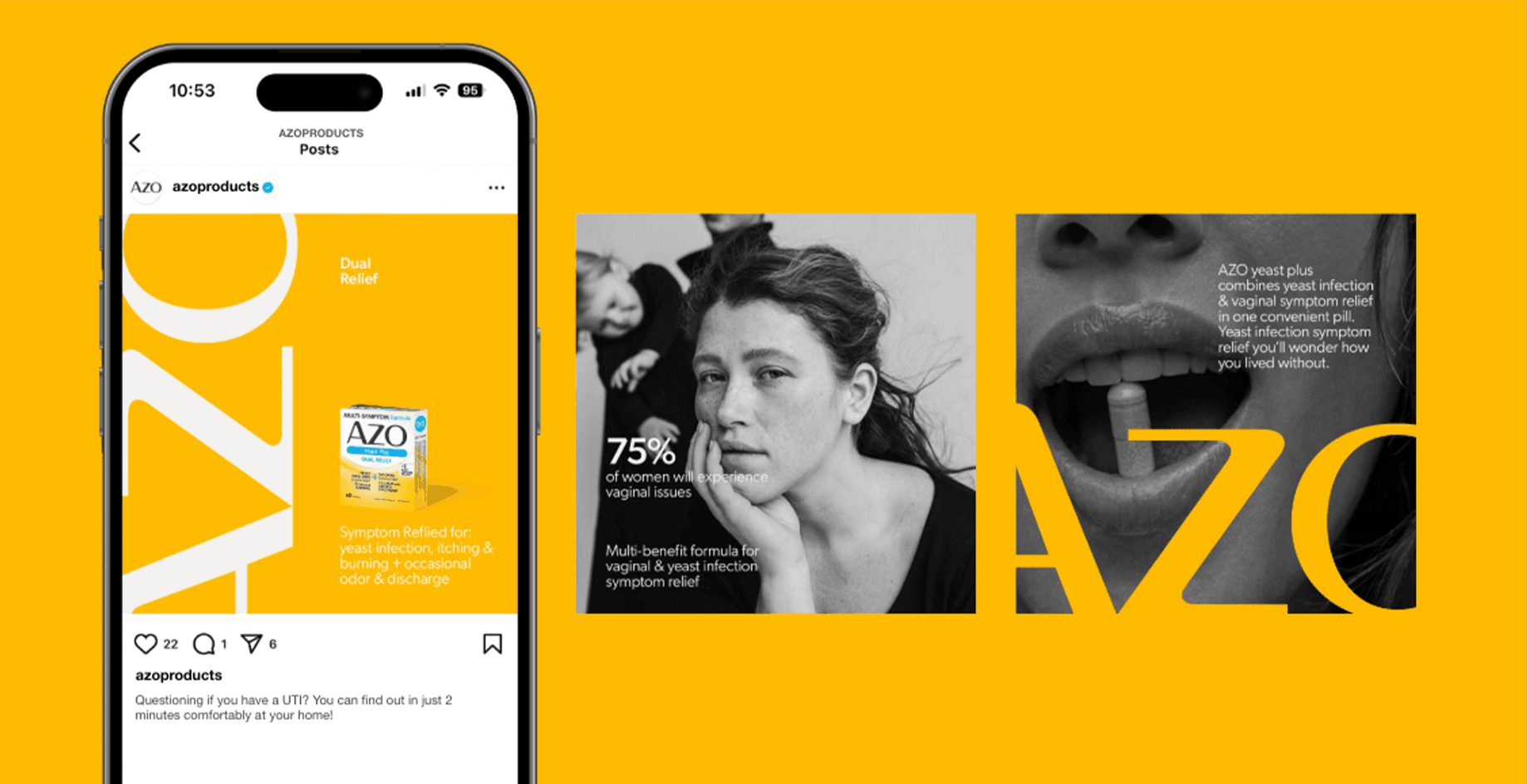 Utilizing large amounts of negative space, on complimentary color backdrops, to create a bold platform for product to stand out. Juxtaposed with emotive black and white photography cropped in unique ways creates an over striking visual language that elevates AZO into a new modern era.